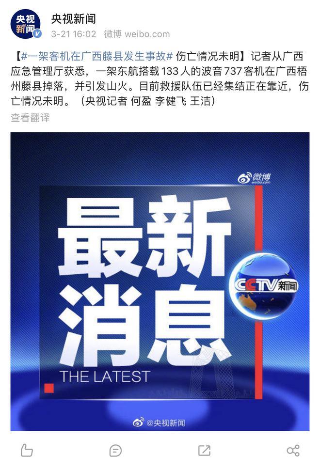 但根据央视新闻报道,从广西应急管理厅获悉,一架搭载133人的东航客机在广西梧州藤县掉落,并引发了山火,情况未明,现在救援队已经集结出动,正在向事发地点靠近。