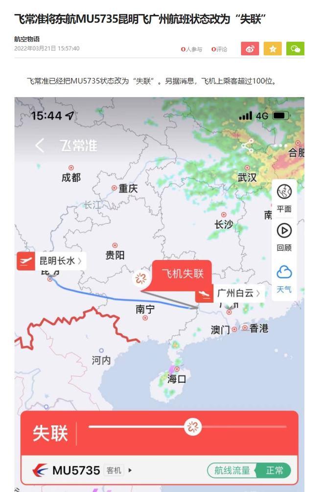 虽然飞常准将东航MU5735昆明飞广州的航班状态改为:失联。