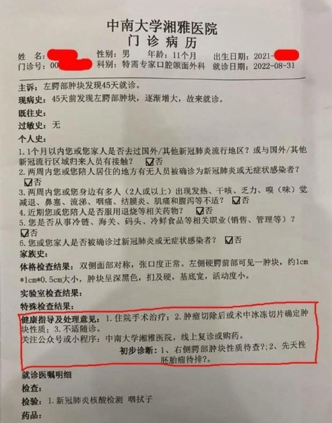 近日,湖南一家长发文爆料:孩子嘴里出现黑色不明“肿瘤”,家长花300元看湘雅专家,被告知要住院并且手术切除,因湘雅医院没有床位,家长换了家医院检查发现是莲子壳。