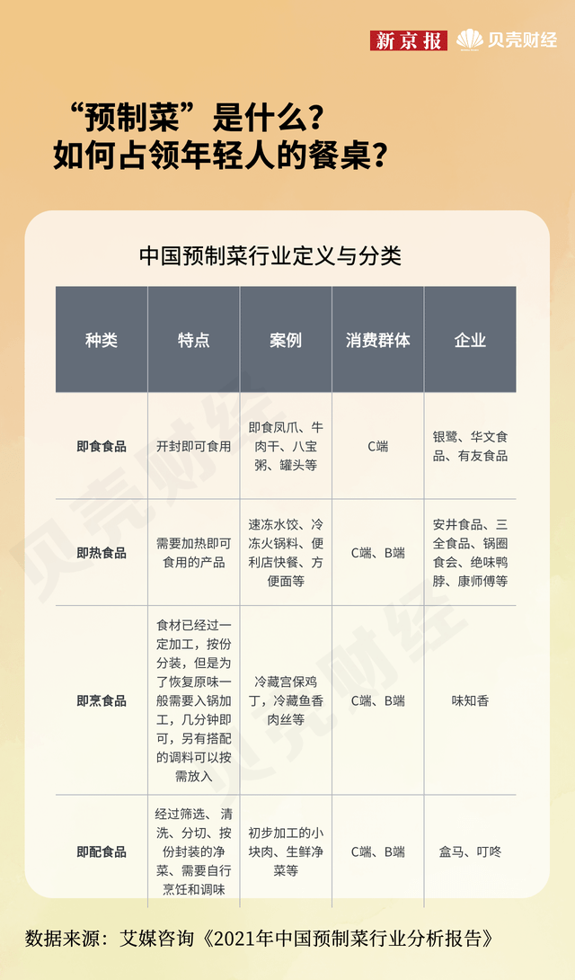 据新京报,预制菜,顾名思义,是指以农、畜、禽、水产品为原料,配以各种辅料,经预加工而成的成品或半成品。通过需要加工的程度多少分为即食食品、即热食品、即烹食品、即配食品。