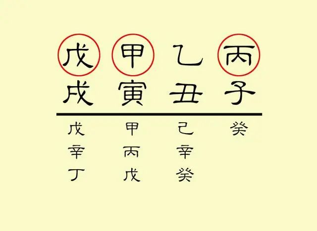 此例当中,地支中甲木、丙火、戊土,都透干而出,而己辛癸藏支不透。