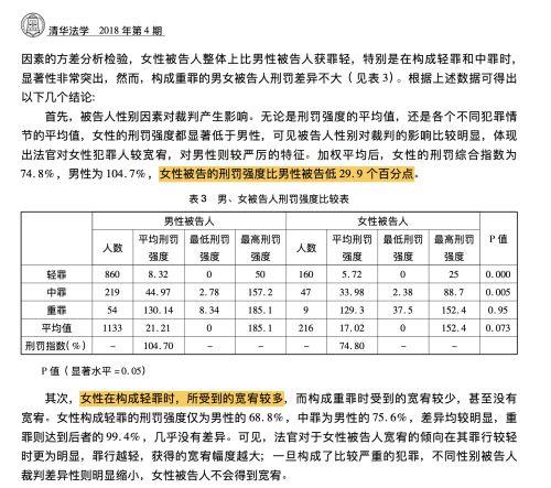 不少人怀疑出现这种区别对待的原因是当事人的性别不同,这个说法并非全无道理。中国社科院学者胡昌明对1060份刑事判决的实证分析显示,同态案件比对证实女性被告的刑罚强度比男性被告低了29.9%,女性在构成轻罪时所受到的宽宥较多。