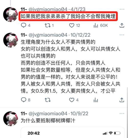 从秋秋老师自己晒出的推特账号来看,她在外网的表现更加极端。一个月前她在和林毛毛的互动中竟然询问起对方「如果我把亲弟弟杀了我妈会不会帮我掩埋」。这已经不是在网上打拳的问题了,完全是在预谋实施犯罪。这样的人有关部门不尽快控制起来是留着等她动手的那天吗?