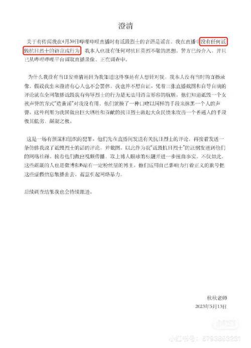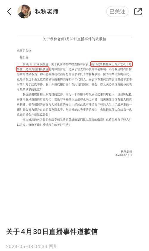 5月3日,秋秋老师在小红书账号发布了一则心不在焉的「致歉信」,其中承认了自己当晚确实发表过「抗日战争牺牲战士百分之八十是男性,是因为他们很便宜」的言论,但是反思的内容多为空话套话,而且最后连真名都没有署,诚意十分有限。