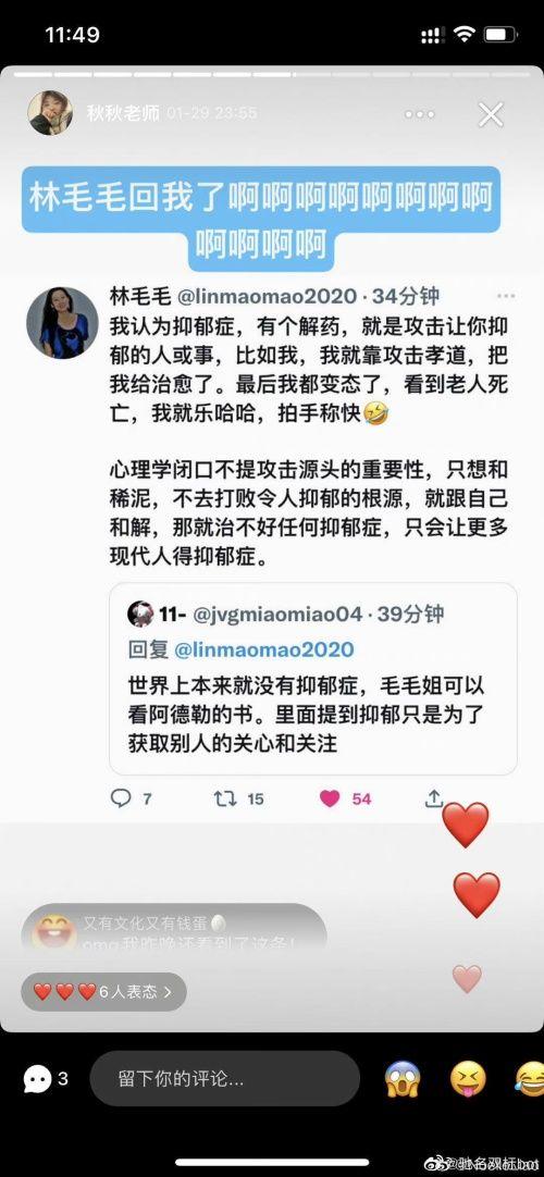 秋秋老师还将境外女权大V「林毛毛」视为偶像,两人频繁互动。熟悉「林毛毛」的人都知道,这是一个已被封杀的极端反华分子,曾主张「不要只反G,要反全部的中国文化」「不要做中国人的妈妈」「女人要害男人很容易」等等。