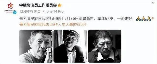 5月26日,据中视协演员工作委员会 消息,著名演员罗京民老师因病于5月26日凌晨逝世,享年67岁。