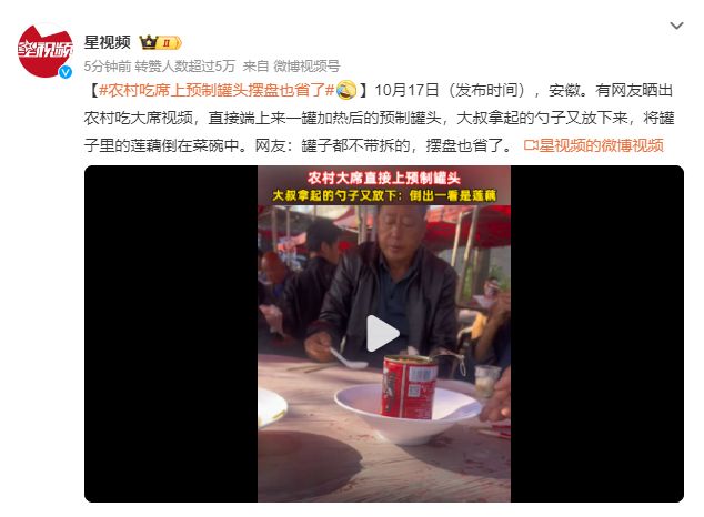 最近,预制菜的势头甚嚣尘上,先是准备进校园,哪想到受到家长们的愤怒抵制,之后这个话题就慢慢淡了下来。现在,又在农村宴席上当起了跳梁小丑,这不,刚刚看到一个热搜,安徽有网友晒出农村吃大席视频,直接端上来一罐加热后的预制罐头,大叔拿起的勺子又放下来,将罐子里的莲藕倒在菜碗中。说是吃席,结果吃成了“零食”,因为只有零食才这样预包装。