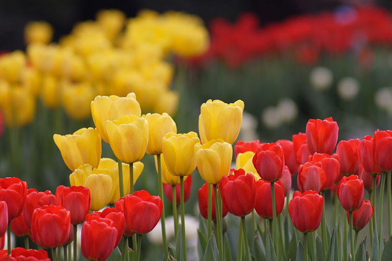 篱笆内,一朵朵红艳艳的郁金香迎着阳光抬着头,喜洋洋地看着游客。旁边围满了拿着手机的游客不时地拍着,边拍边称赞,边拍边享受,还有三两个专业人士拿着高倍单反相机仔细地拍着,不时调整角度,展示着自己的独特的水平。如此美景怎能错过,我也赶紧凑上前去用手机拍了两张,但是镜头竟然被一个妇女的半边挡住,不时人来人往,一直等了二十分钟都没拍好一张满意的照片,最后只好放弃。