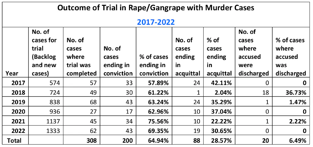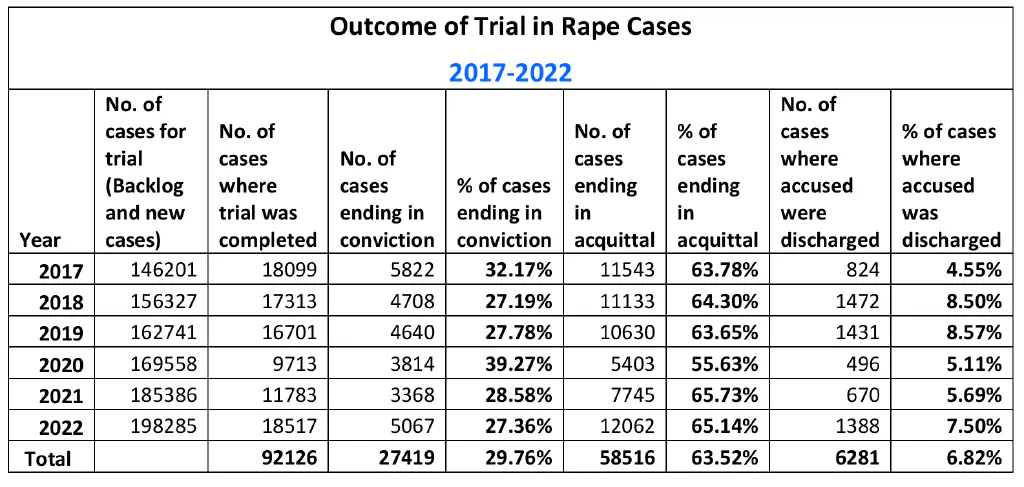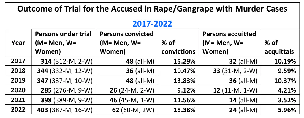 在法院审理阶段,印度 6 成以上的强奸案都在法院作出无罪判决,最终每年因强奸案进监狱的人数平均不到 1 万人。甚至于,在强奸杀人案中,无罪判决的比例也接近 30 %。
