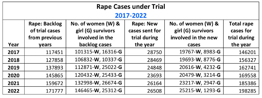 比如上边这个印度法院审理强奸案的数据。2022年印度法院积压了 17万起强奸案未审理。占新收案件的接近 7 倍。