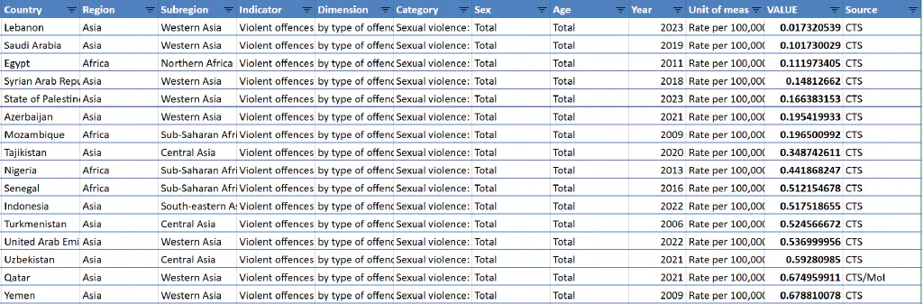 我筛选了一下表上 150 多个国家和地区强奸率数据,其中有的国家因为没有最新数据,使用的是表上最近一年的数据。