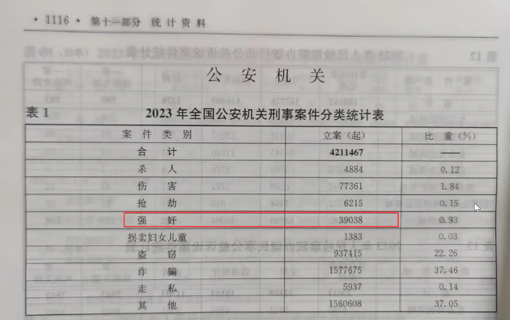 我手头上正好有一本 2024 年《中国法律年鉴》,上边摘录了 2023 年公安部的刑事立案数,其中强奸立案是 39038 宗。按照国际通用的每 10 万人犯罪率换算下来,大约是 每 10 万人 2.8 件。