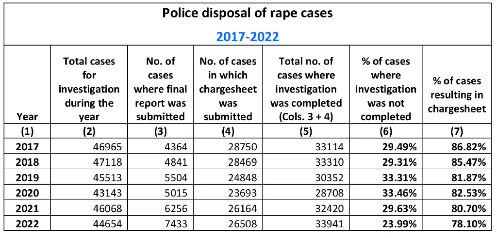 在调查取证阶段,每年印度都有 2 成以上的强奸案在调查后被撤销。最终送到法院的案件数,平均每年只有 2.6 万件。大概只占调查总数 6 成。