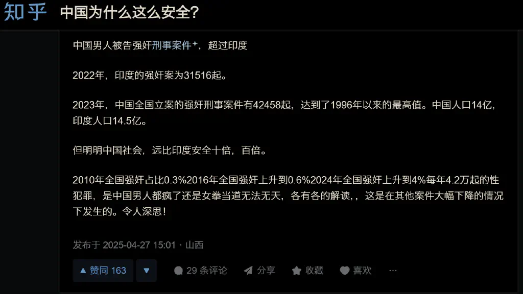 在知乎上看到一个稀奇古怪的观点,说当前中国的强奸率比印度还高,质疑中国是否还是一个安全的国家。经过一番研究,发现这背后确实存在一些有意思的现象。