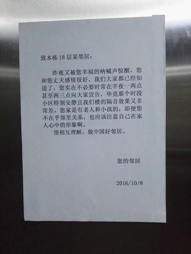 早上看到一个让人啼笑皆非的新闻,说是重庆沙坪坝某小区夫妻生活声音太大,其“幸福的呐喊”打扰了周围居民的休息,被人在电梯里贴告示提醒。“昨晚又被您幸福的呐喊声惊醒,您和您丈夫感情很好,我们大家都已经知道了”,提醒该住户应注意控制私生活时的声音,已经对周围住户造成了影响。